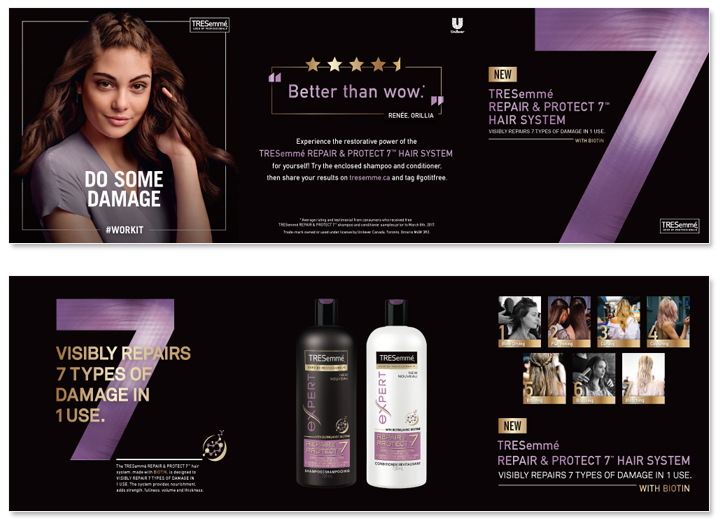 Background: To introduce TRESemmé’s new line shampoo and conditioner, materials developed for various salon activations across Ontario, Quebec and British Columbia. In a production role, I was tasked to develop mural posters to be hung on salon walls. We also developed brochures with sachet samples to be handed out to salon customers. Also worked with Art Director on designing a “wild posting” that were done on several locations in downtown Toronto. To support social media initiatives, I was tasked to develop Facebook and Instagram banners. In Montreal, I was responsible for executing most of the print deliverables for a JamVan activation.